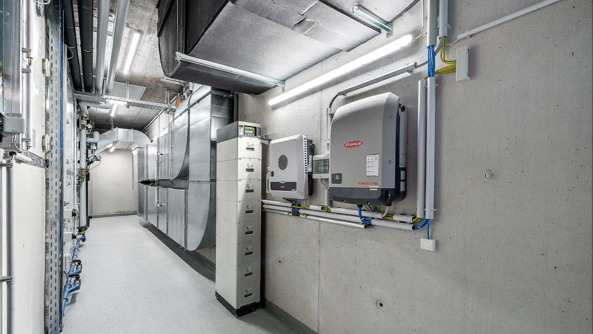 Im gesamten Neubau wurde eine normgerechte E-Installation umgesetzt – inklusive Innenbeleuchtung, Sicherheitseinrichtungen sowie Technik für Büroräume, Verkehrswege und Nebenräume.