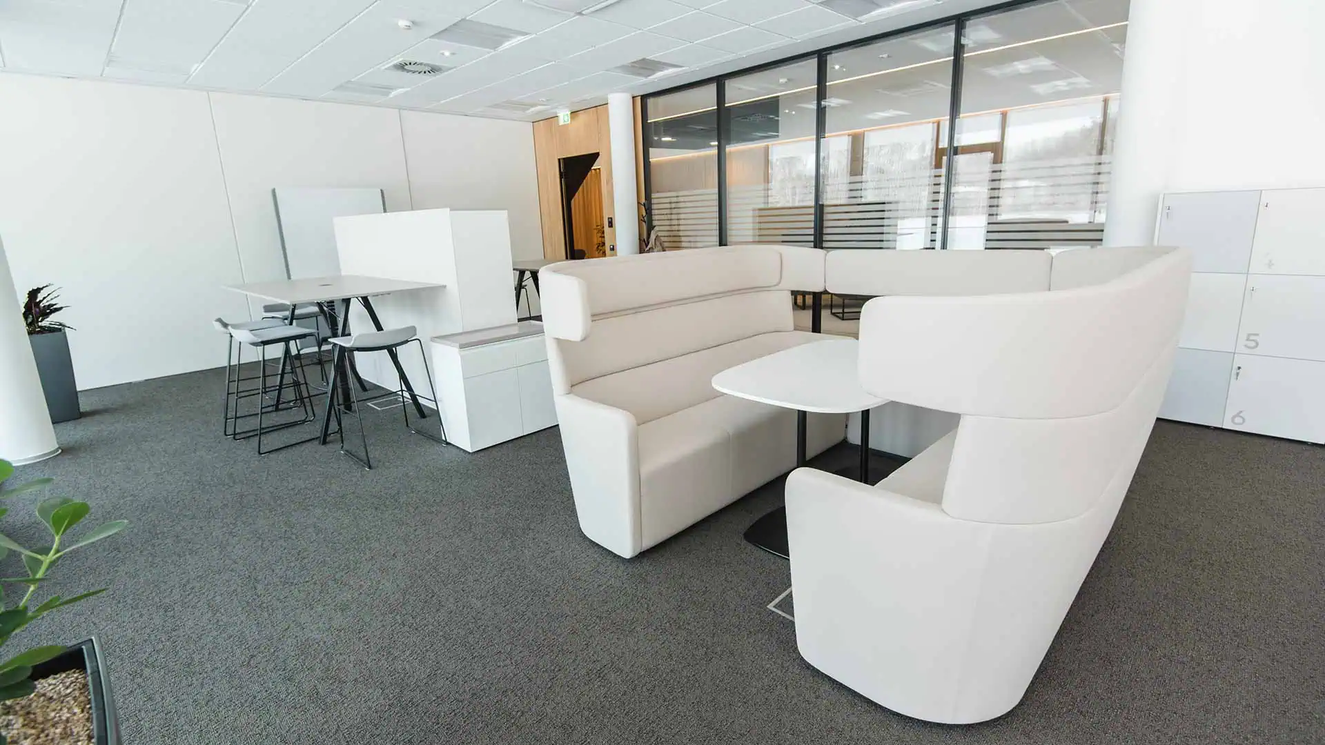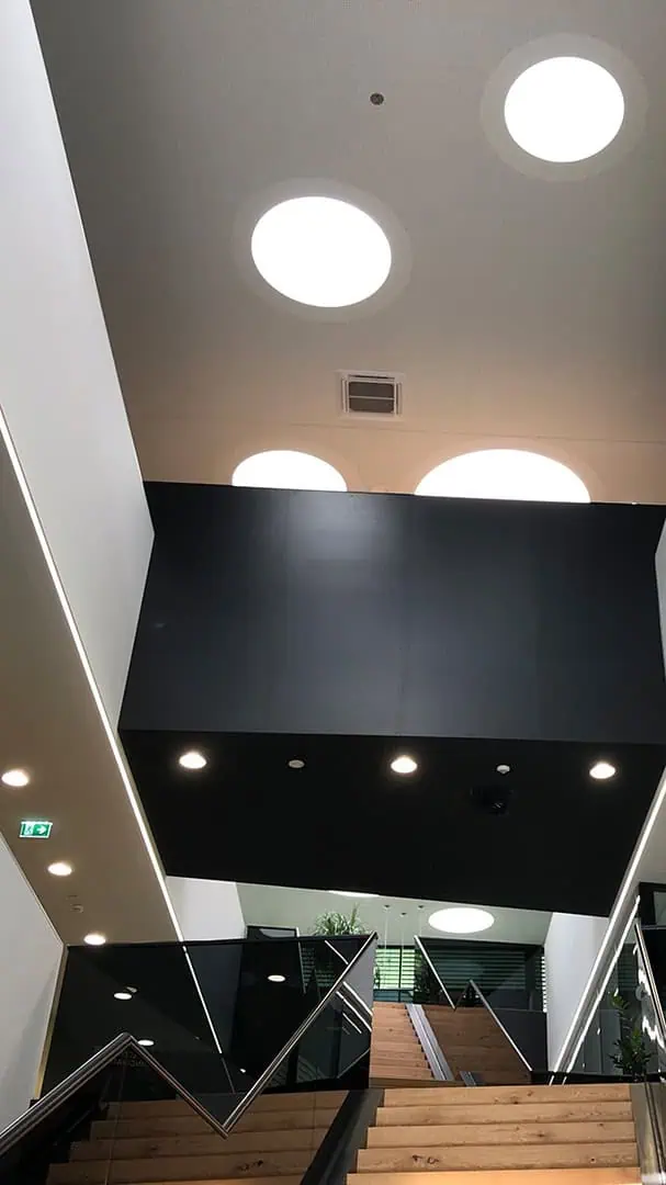 Individuell abgestimmte LED-Beleuchtung für Büroräume, Besprechungszonen und Bistro. Die Notlicht-Orientierung sorgt zusätzlich für maximale Sicherheit.