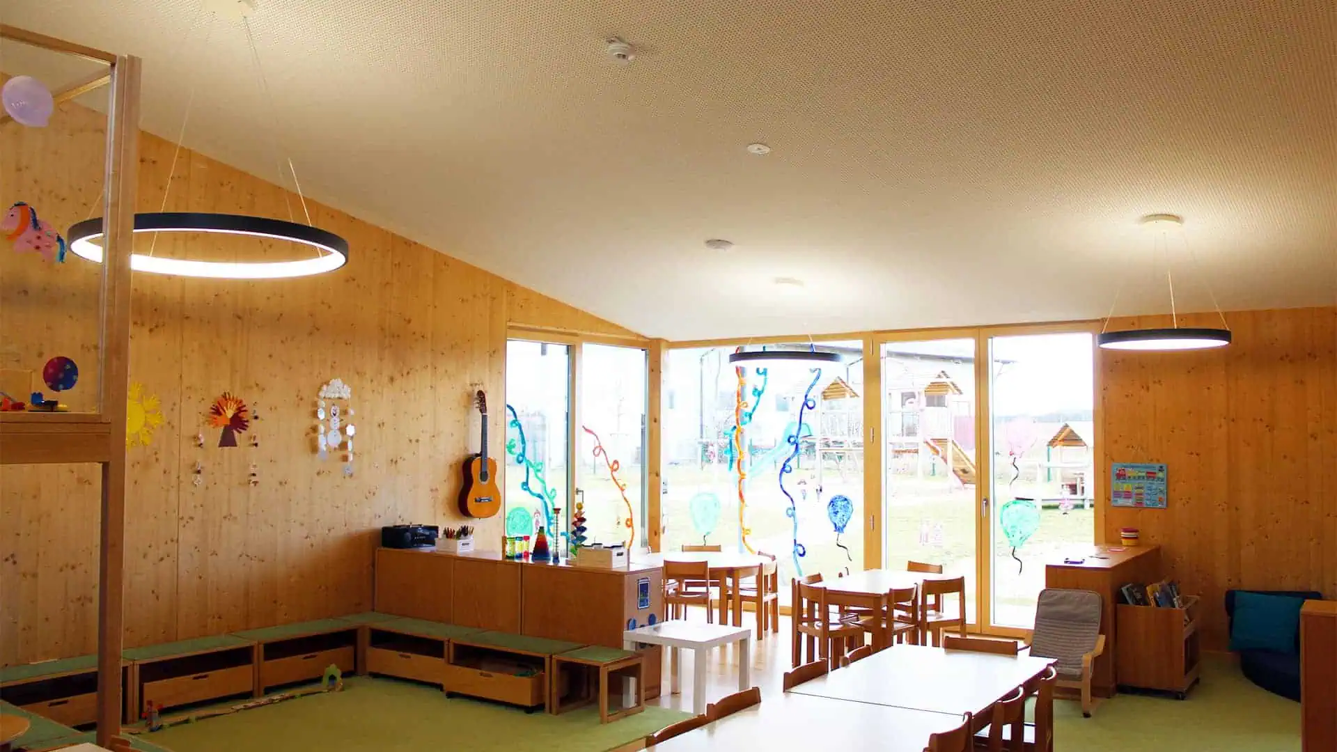Im ökologischen Neubau Kiga VI installiert Kremsmair effiziente LED-Beleuchtung sowie sichere Notlicht- und Brandmeldeanlagen.